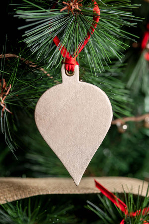 This classic teardrop ornament shape adds a sophisticated touch to your Christmas tree. Made with gorgeous drum-dyed leather and finished to a beautiful sheen, this ornament is both elegant and durable, and makes for the perfect family tree addition.